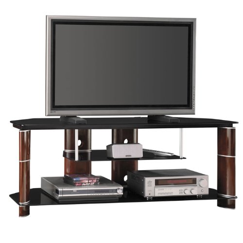 Rosebud Cherry with Bright Silver Finish Accommodates most 60" flat panel TVs up to 154 lbs. Coordinates with Audio Tower AD11540A-03Fixed, tempered glass shelves Solid wood segments separated by decorative metal rings Rear wire access and concealment Assembly required